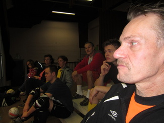 Mighty Dicksin ja Nuestro Sexon ottelu päättyi Dicksille lukemin 5-3. Loukola ja Lindholm odottelee että Mäenpää nappaa pallon Hakalalta. Olli seuraa silma tarkkana tilannetta