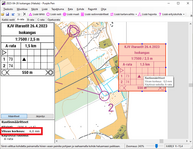 Rastinmääriteluettelon kokoa ja muotoa voi säätää sinisistä tarttumapisteistä, jotka tulevat esiin, kun rastinmääriteluettelo valitaan hiirellä klikkaamalla. Valmiissa karttapohjassa rastimääriterivit ovat kuuden millin korkuisia. Hyvä korkeus on 5-6 mm.
